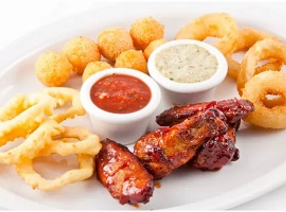 Куриные крылышки, луковые кольца, картофельные шарики, чесночные гренки