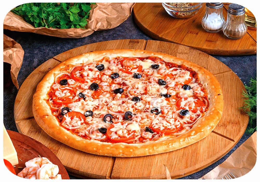 Итальянский соус, креветки тигровые, маслины, сладкий перец, лук красный, сыр моцарелла